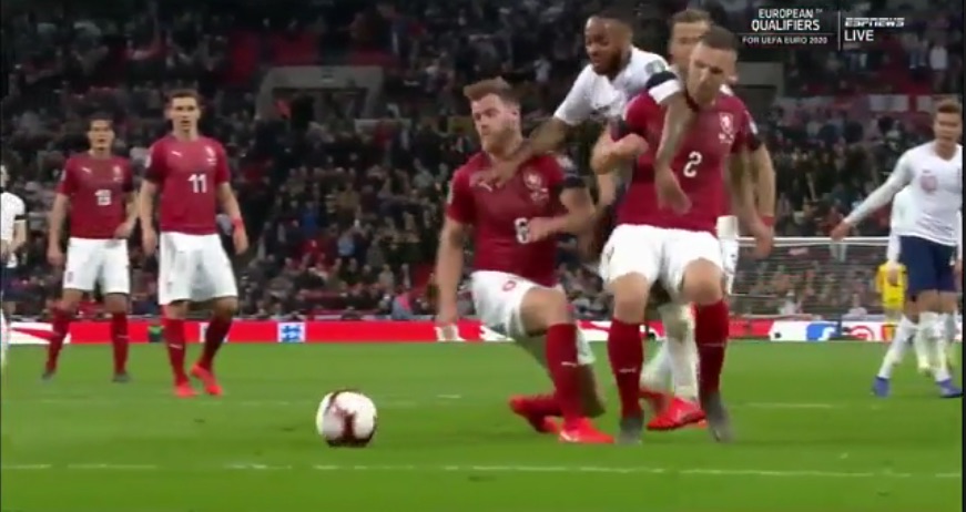 Второто попадение пък дойде след дузпа, отсъдена срещу Стърлинг. При това положение двама защитници на Чехия блокираха чисто играча на Трите лъва, той ги хвана с двете ръце и се хвърли върху гърбовете им, а топката отиде във вратаря.