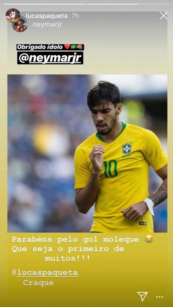 Ней поздрави Пакета чрез официалния си профил в Instagram, като му пожела да отбележи още много попадения с екипа на Бразилия. Роденият през 1997 година футболист на Милан игра с номер 10, който през годините бе носен от футболни величия като Пеле, Зико, Роналдиньо, Кака, Ривалдо и за последно от Неймар.