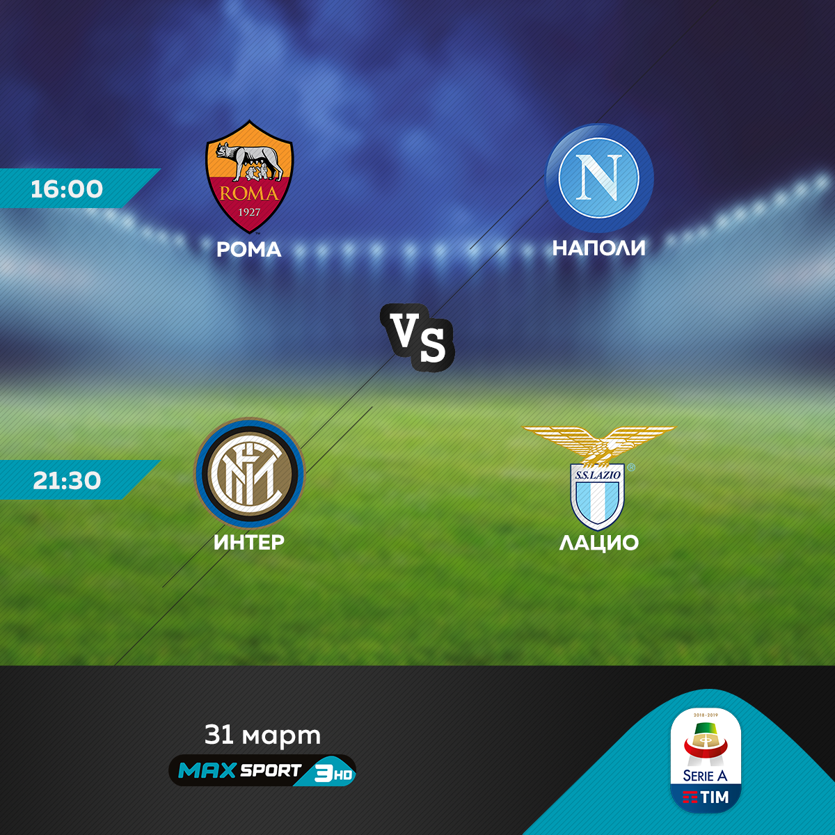 Неделният ден от 29-ия кръг на Серия А също обещава да е интересен, като акцентът пада върху директните битки между тимовете, гонещи участие в Шампионската лига. От 16:00 часа Рома посреща Наполи, а в 21:30 часа Интер е домакин на състава на Лацио. Тези два сблъсъка, както и всичко най-интересно от кръга на Апенините, ще са част от преките излъчвания на