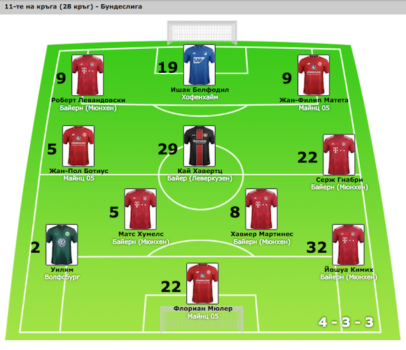 Напълно според очакванията Байерн (Мюнхен) доминира в “11-те” на Sportal.bg за изминалия 28-и кръг в германския шампионат. Шампионите разгромиха Борусия (Дортмунд) с 5:0 и отново са на върха. Разписалите се в срещата Роберт Левандовски, Матс Хумелс, Хавиер Мартинес и Серж Гнабри, както и Йошуа Кимих заслужиха да са сред отличените заради играта си на “Алианц Арена”. По принцип почти всички в червени екипи заслужаваха нещо подобно, но да не оставяме другите отбори на заден план.