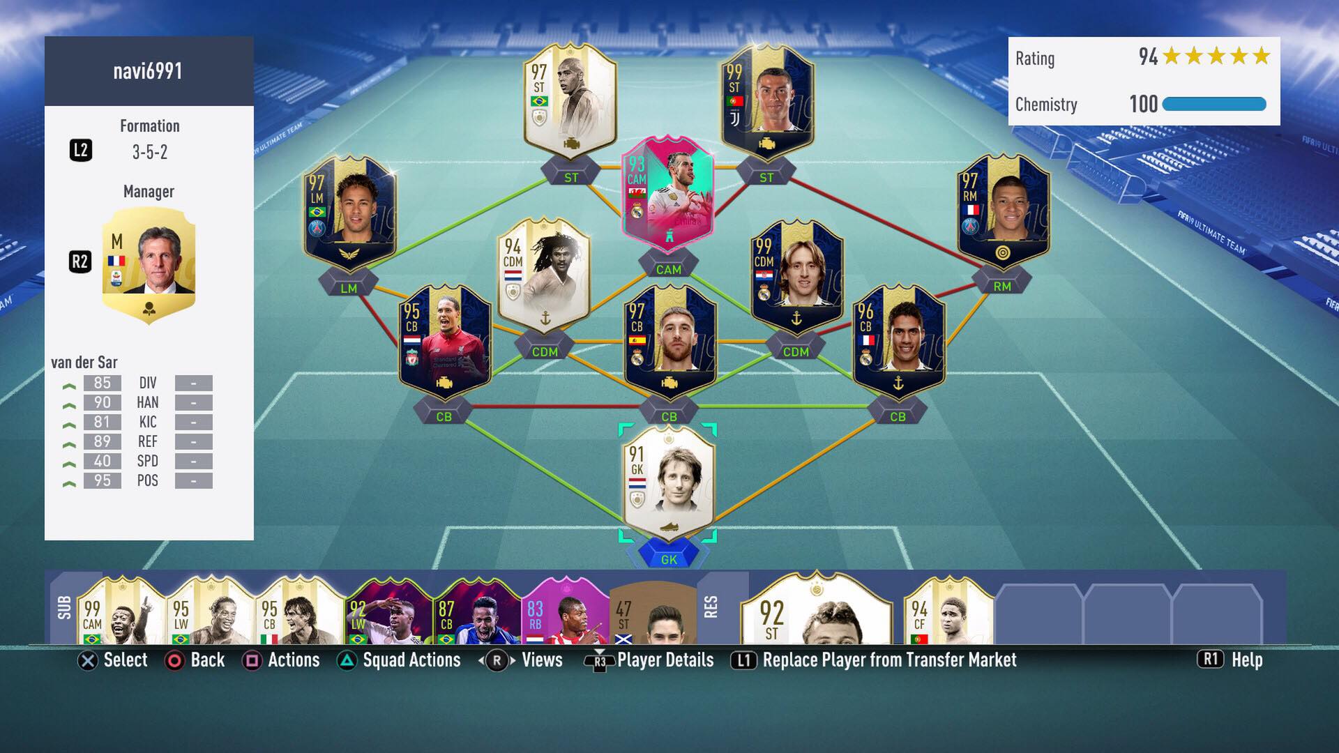 На вратата ще започне Едвин ван дер Сар, а пред него са Серхио Рамос, Рафаел Варан и Ван Дайк. В халфовата линия ще бъдат Рууд Гулит и Лука Модрич, а пред тях ще действа Гарет Бейл, което е и изненадата в състава на българина. По фланговете са Килиан Мбапе и Неймар, а на върха ще са бразилската легенда Роналдо и Кристиано Роналдо. Сред резервите личат имената на Еузебио, Пеле и Христо Стоичков.