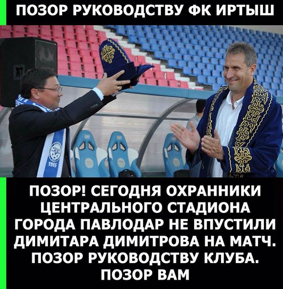 Шефовете на Иртиш не би трябвало да се гордеят с действията си спрямо българския специалист Димитър Димитров. Казахстанските медии съобщиха, че Херо и щабът му не са били допуснати до стадиона за мача с Жетису в сряда, въпреки че са имали желание да бъдат начело на тима. Вследствие на това двубоят е бил ръководен от временния наставник Андрей Ненашев. Димитров все още има действащ договор с клуба и съвсем логично се е явил на стадиона, за да води срещата. След като не е бил допуснат до стадиона, наглостта на шефовете на Иртиш продължила. Sportal.bg научи, че малко по-късно Херо е получил на пощата съобщение от ръководството, в което го питат защо не се е появил на мача.