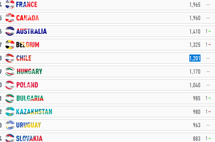 В момента България е под №21 с 985 точки, непосредствено зад страната ни е Казахстан (980) и Уругвай (963). Полша (1,040), Унгария (1,170) и Чили (1,201) са съставите пред България.