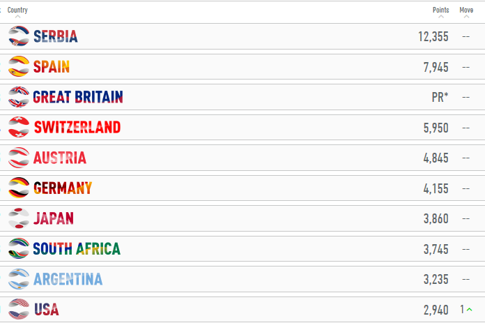 Благодарение на Новак Джокович, Сърбия е първа –  12,355 точки, следвана от Испания и Рафаел Надал.