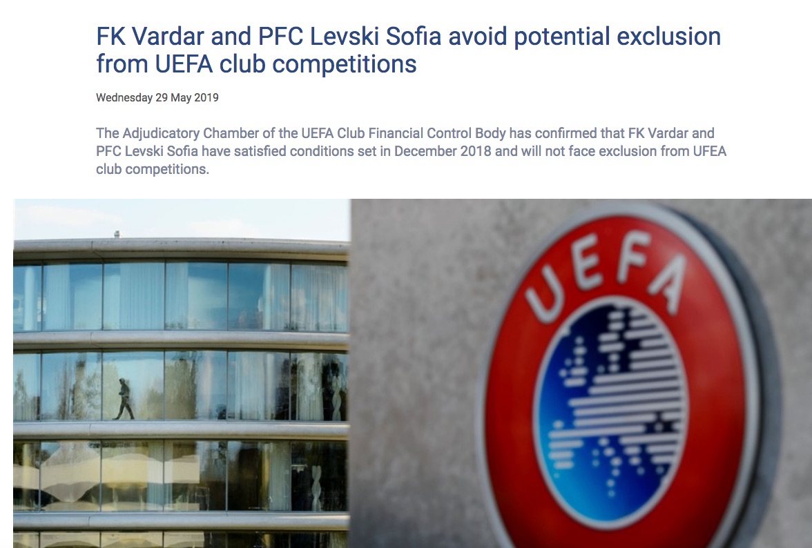 "Левски показа доказателства пред Контролния орган за финансите на клубовете, които удовлетвориха членовете на Съдебната камара и показаха, че дълговете са изплатени, а сроковете са спазени. Точно затова наказанието за изваждане от Европа се отменя и няма да влезе в сила изобщо", написаха от УЕФА на сайта си.