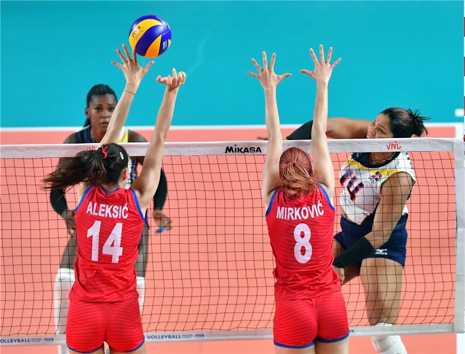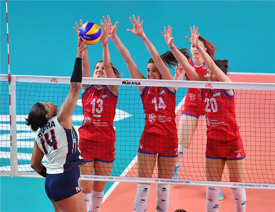 Световните шампионки от Сърбия не позволиха изненада от отбора на Доминиканската република в Лигарта на нациите. "Плавите" се наложиха над опонентките си с 3:1 (25:17, 18:25, 25:12, 25:19) в двубой от група 5 на надпреварата в Конеляно.
