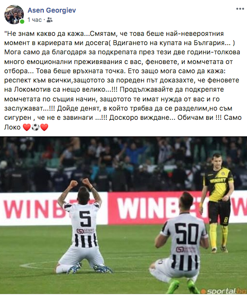 Защитникът Асен Георгиев се раздели с Локомотив (Пловдив). Днес бранителят публикува емоционално съобщение в официалния си профил във “Фейсбук”, в което се върна към момента със спечелването на Купата на България. Георгиев благодари и на феновете.