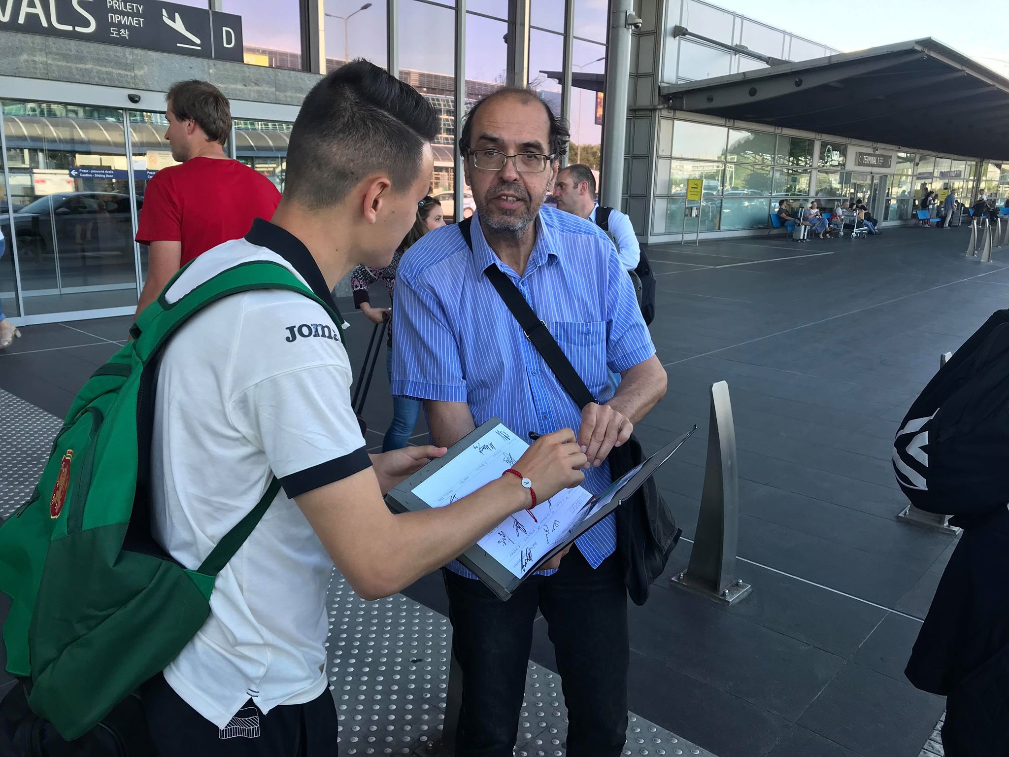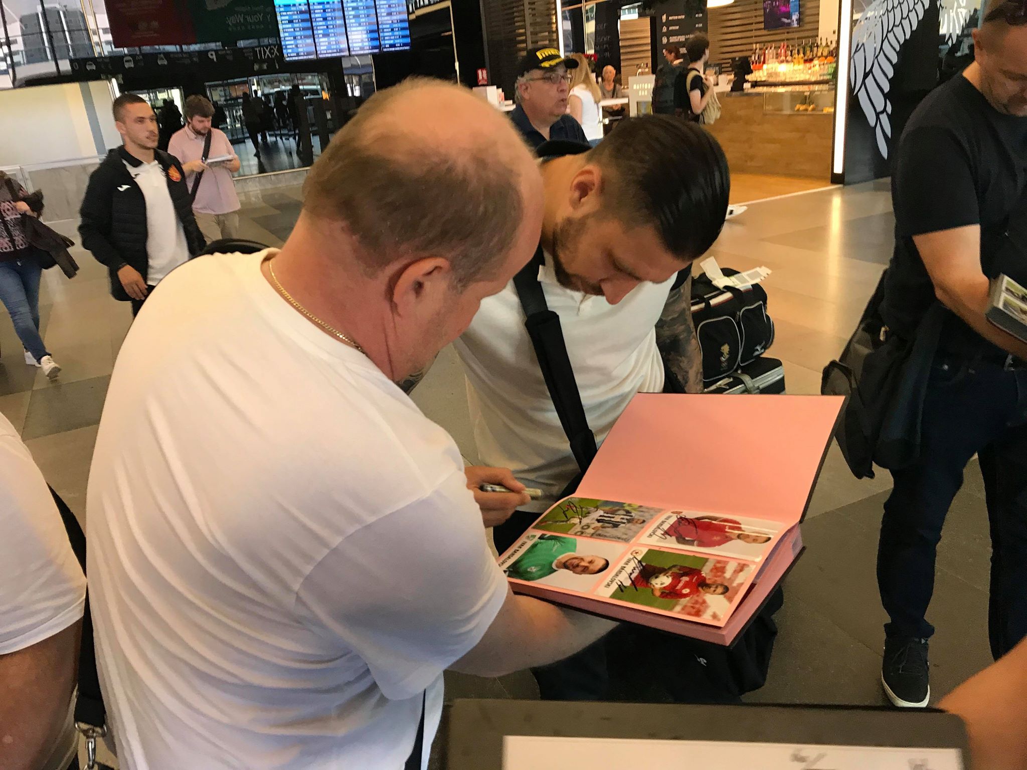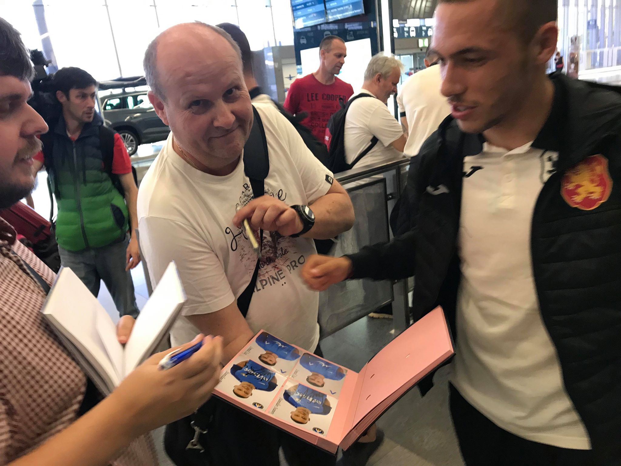 Автографи раздаде и селекционерът Красимир Балъков, който се готви за своя дебют начело на трикольорите. "Лъвовете" от своя страна разписаха свои снимки и зарадваха българите на летището.