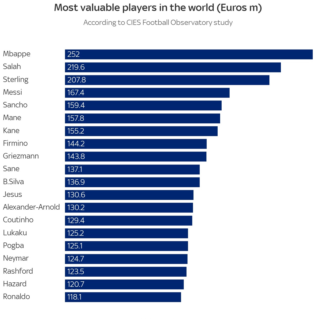 Според последното изследване Килиан Мбапе в момента струва 252 милиона евро, а втори е Мохамед Салах, чиято цена е 219.6 милиона. Рахийм Стърлинг (207.8 млн), Лионел Меси (167.4 млн) и Джейдън Санчо (159.4 млн) запълват петицата.
