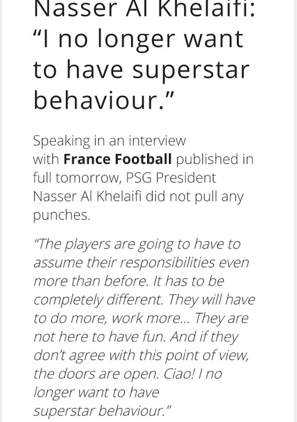 Край на прищевките и безумните претенции на скъпоструващите звезди на Пари Сен Жермен. Поне това обеща президентът на френския гранд Насер Ал-Хелаифи, който явно е решен да наложи нови порядки в клуба. Пред ”France Football” той заяви, че ако някой не е доволен от присъствието си в отбора, може да напусне.