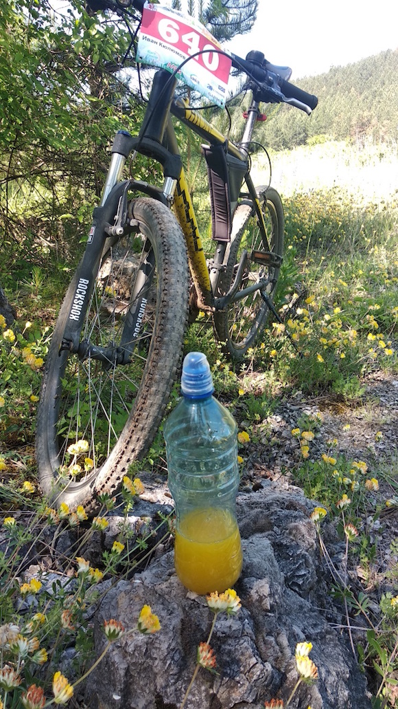 След невероятното спускане успях да достигна до първия контролен пункт – въобще и не спрях на него, защото бе още приятно хладно и имах пълен кемълбег с вода, а ме очакваха още много километри. Посока – Студена. Най-приятната част – лек терен с приятно време и добро темпо. Всички се движим равномерно, липсват изненади, с изключение на едно мое падане. Съвет – стърчащите корени са враг номер едно на тутраканската селищна система – след като успях странично да закача един от корените, направих невероятно салто, за което получих ръкопляскания и овации. Носете си каските и внимавайте с корените и камъните по трасето. Докато минавахме покрай язовир Студена, вече усещах, че имам нужда от енергия. В момента, в който спуках отново гума. Ето ви един трик – можете да си разтворите
