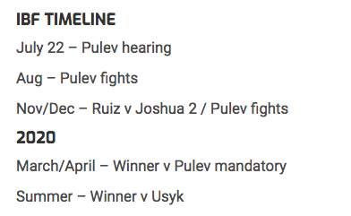 Независимо дали това ще е Анди Руис, или Антъни Джошуа след реванша помежду им. От боксовото издание твърдят, че е много възможно Кобрата да има бой през август месец и след това още един, който да е ноември или декември. Когато е плануван и вторият епизод между Руис и Джошуа. Това означава, че чак през 2020 година - март или април, Пулев най-сетне би могъл да излезе в битка за световната титла.