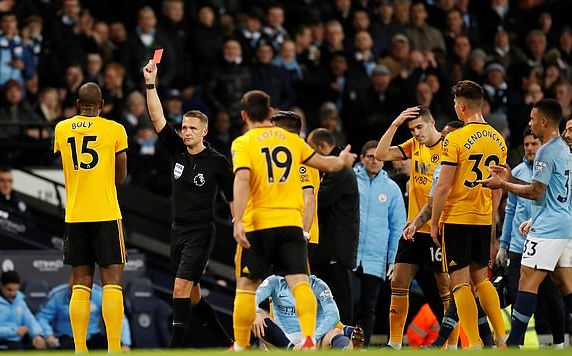 В 19-ата минута Уулвърхамптън остана с човек по-малко, след като Уили Боли получи директен червен картон за агресивно влизане в краката на Бернадро Силва, макар да игра първо с топката.