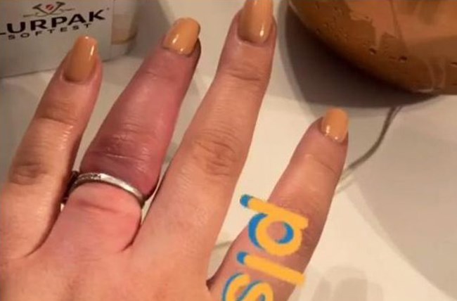 А резултатът - посинен пръст на клетата Меган. Тя едва извадила бижуто от ръката си след неимоверни усилия.