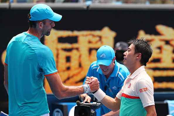 Трикратният четвъртфиналист Кей Нишикори (Япония) се класира за третия кръг на Откритото първенство на Австралия по тенис. Поставеният под номер 8 Нишикори преодоля 59 аса на Иво Карлович и елиминира 39-годишния хърватски ветеран с 6:3, 7:6 (6), 5:7, 5:7, 7:6 (10-7) след 3:48 часа игра. Японецът допусна само 17 непредизвикани грешки срещу 43 на Карлович, което в крайна сметка натежа.