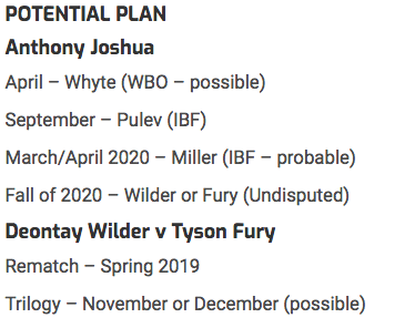Желаният от боксовите фенове мач между Джошуа и световния шампион на Световния боксов съвет (WBC) Дионтей Уайлдър (САЩ) или Тайсън Фюри (Великобритания) за обединяване на всички световни титли може да се състои най-рано през есента на 2020 година.