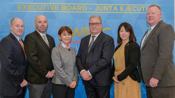 От ляво на дясно: Изп. директор на USA Baseball Пол Сайлър, президентът на FFBS Дидие Семине, вицепрезидентът на JSA Таеко Уцуги, президентът на WBSC Рикардо Фракари, членът на борда на BFJ Хироко Ямада и генералният директор на USA Softball Крейг Крес след подписването на меморандума