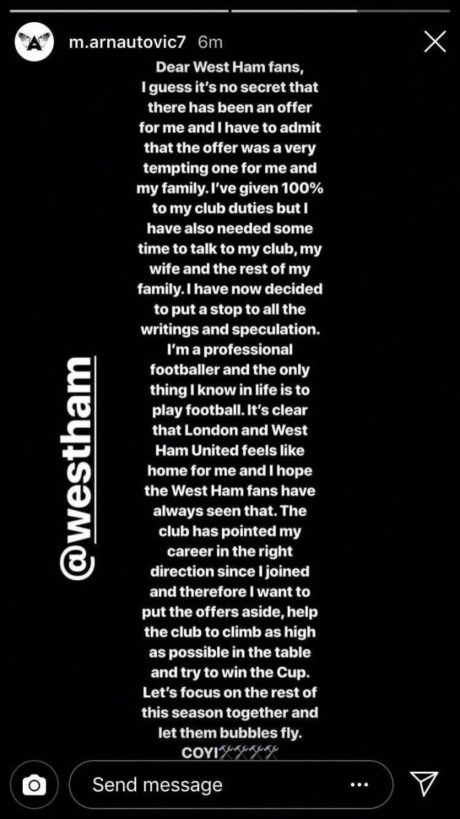 За да сложи край на спекулациите и да се съсредоточи върху задълженията си на футболист, самият Арнаутович реши да обяви от свое име какво е бъдещето му и то е свързано с Уест Хам поне в близките месеци до края на сезона.