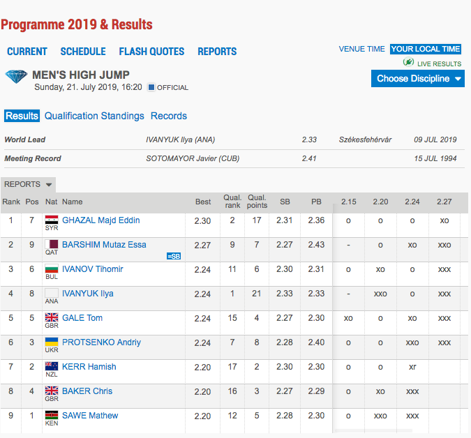 Победител в състезанието стана сириецът Мажд Един Газал с 230 сантиметра. На второ място остана катарецът Мутаз Баршим с 227 сантиметра. За Баршим, който е световен шампион от 2017 година, това бе изравнен най-добър резултат за сезона.