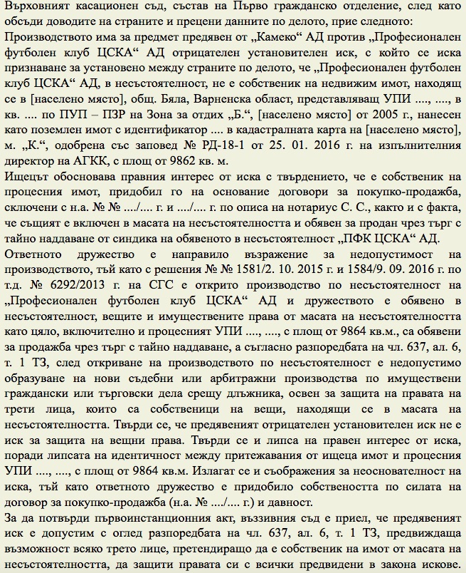 Именно ВКС е последната инстанция, пред която ЦСКА може да обжалва и червените го правят, но вчера съдът излиза с определение в полза на “Камеко”, което гласи следното: