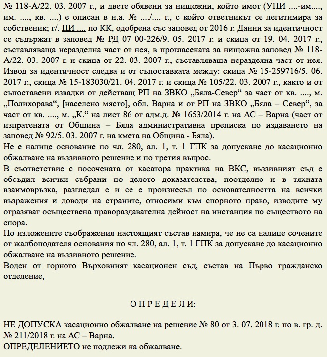 НЕ ДОПУСКА касационно обжалване на решение № 80 от 3. 07. 2018 г. по в. гр. д. № 211/2018 г. на АС – Варна.