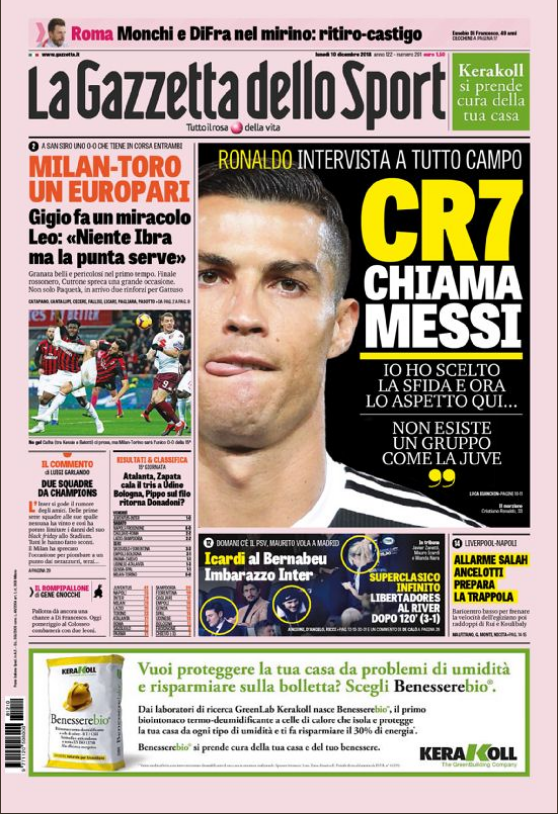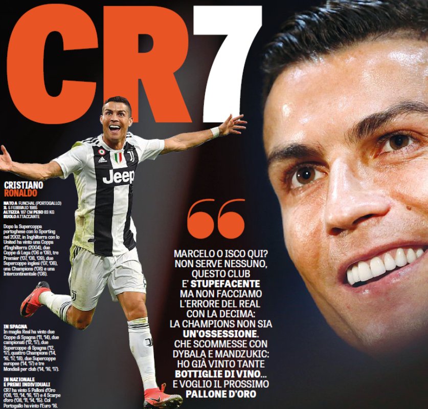 Суперзвездата на Ювентус Кристиано Роналдо даде интервю съвместно за Gazzetta dello Sport и Corriere dello Sport, в което разкри как се чувства в Торино, как приема избора на Лука Модрич за най-добър в света и дали му липсва съперничеството с Лионел Меси.