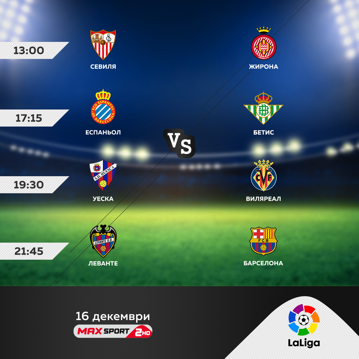 През уикенда MAX Sport 2 ще излъчи директно 8 мача от XVI кръг на испанската Ла Лига. В събота са мачовете Хетафе – Реал Сосиедад (14:00 часа), Валядолид – Атлетико Мадрид (17:15 часа), дербито на Мадрид между Реал Мадрид и Райо Валекано (19:30 часа) и Ейбар – Валенсия (21:45 часа).