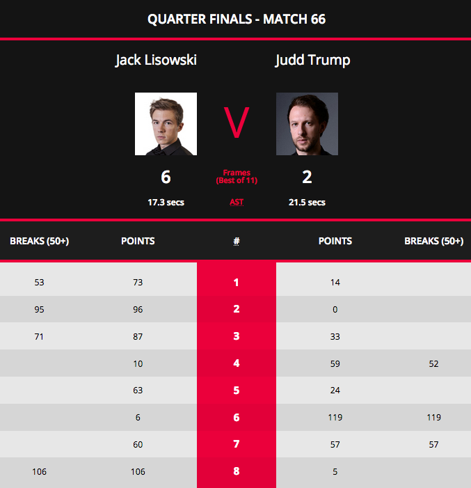 Зрителите очакваха атакуващ и приятен за гледане снукър и го получиха, като единствено в петия фрейм не бе реализиран брейк над 50 точки. Лисовски продължи да поддържа изключително бързо взимане на решения край зеленото сукно със средно 17.3 секунди на удар, а Тръмп също бе отличен в това отношение със своите 21.5 секунди.