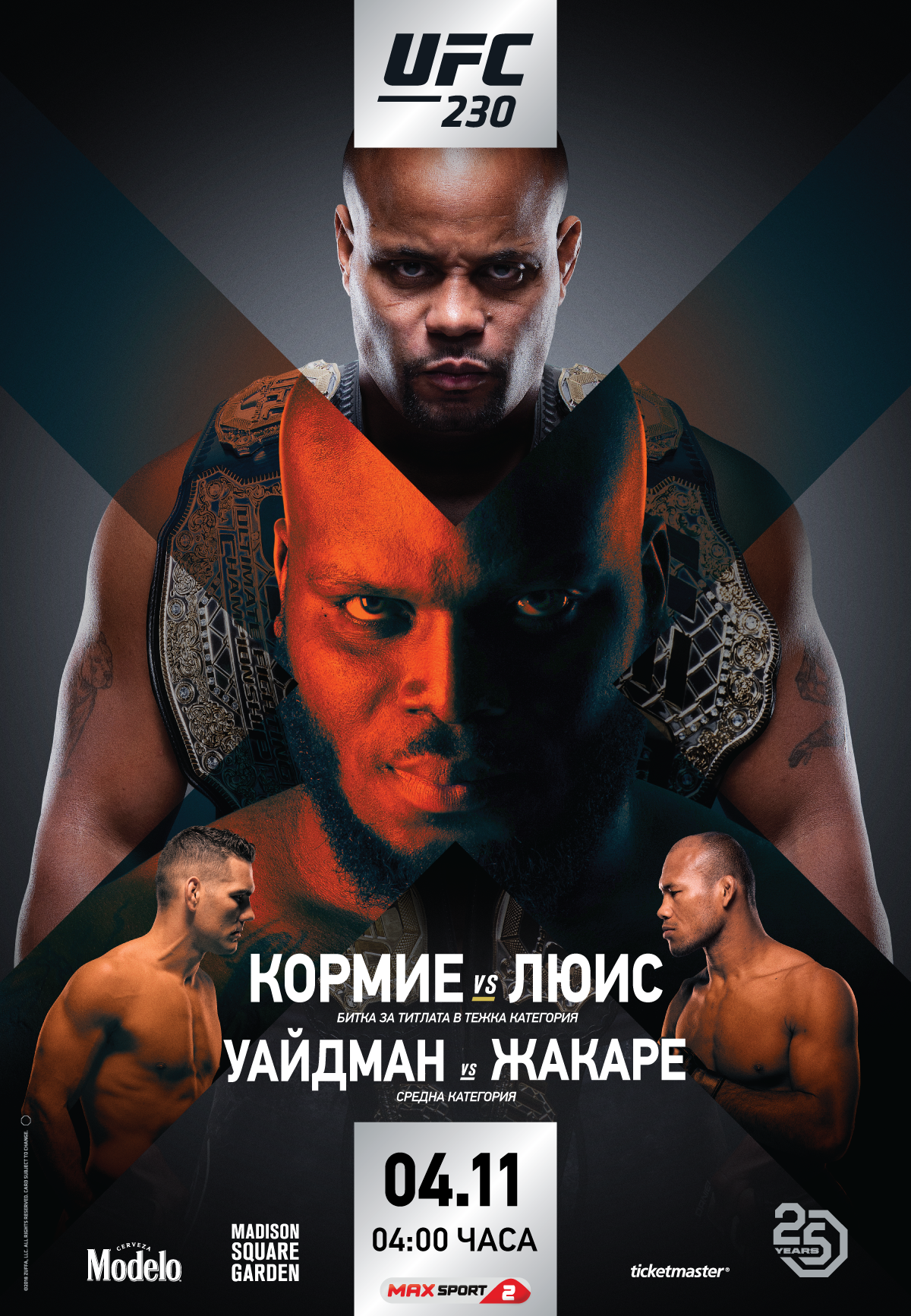 Преди сблъсъка Кормие – Люис на октагона ще видим и мача между Крис Уайдман и Жакаре Соуза в средна категория. При успех Уайдман ще получи шанс в следващия си двубой да се бие за шампионския пояс. UFC 230 ще може да се проследи пряко в неделя от 04:00 часа сутринта по MAX Sport 2.