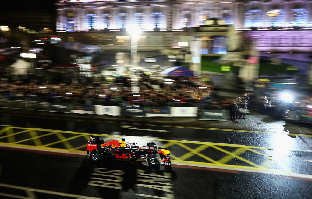 Бившият пилот на Ред Бул Дейвид Култард пое управлението над шампионския болид на отбора от 2012 г. и направи грандиозно нощно шоу пред 35 000 души на улицата в ирландския град Белфаст. Преди осем години отборът направи подобно шоу, но с два пъти по-малко публика.