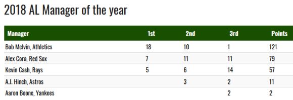 В АЛ 57-годишният Мелвин събра сбор от 121 т., след като бе посочен 18 пъти на първо място, 10 пъти на второ и веднъж на трето. Негови подгласници станаха наставникът на шампиона Бостън Ред Сокс Алекс Кора (79 т.) и този на Тампа Бей Рейс Кевин Кеш (57 т.). Анкетата приключва в края на редовния сезон и не отразява представянето в плейофите.