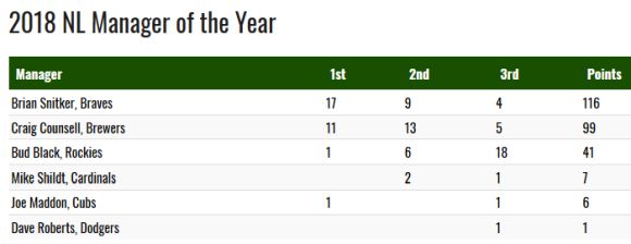 В НЛ пък Сниткър натрупа 116 т. от 17 първи места, 9 втори и 4 трети. Топ 3 допълниха Крейг Каунсел (Милуоки Бруърс) с 99 т. и Бъд Блек (Колорадо Рокис) с 41 т. 63-годишният ветеран е първият мениджър на Атланта, избран за №1 през годината, след легендата Боби Кокс през 2005 г.
