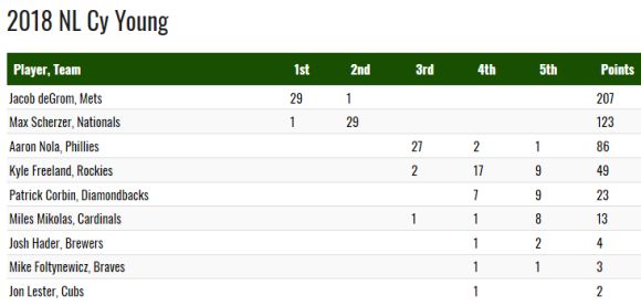 Асът в ротацията на Ню Йорк Метс Джейкъб Дегром спечели наградата "Сай Йънг" за най-добър питчер в Националната лига на МЛБ през 2018 г. Трикратният носител от Вашингтон Нешънълс Макс Шързър (2013, 2016, 2017) финишира втори в гласуването и бе лишен от възможността да стане първият след члена на Залата на славата Ранди Джонсън (1999-2002), удостоен с приза в три поредни сезона.