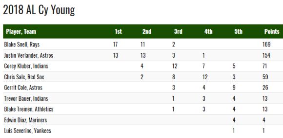 В Американската лига "Сай Йънг" бе присъдена на аса на Тампа Бей Рейс Блейк Снел. 25-годишната изгряваща звезда на "лъчите" намери място в Топ 3 на всяка от 30-те анкетни карти – 17 първи, 11 втори и две трети места за общо 169 т.