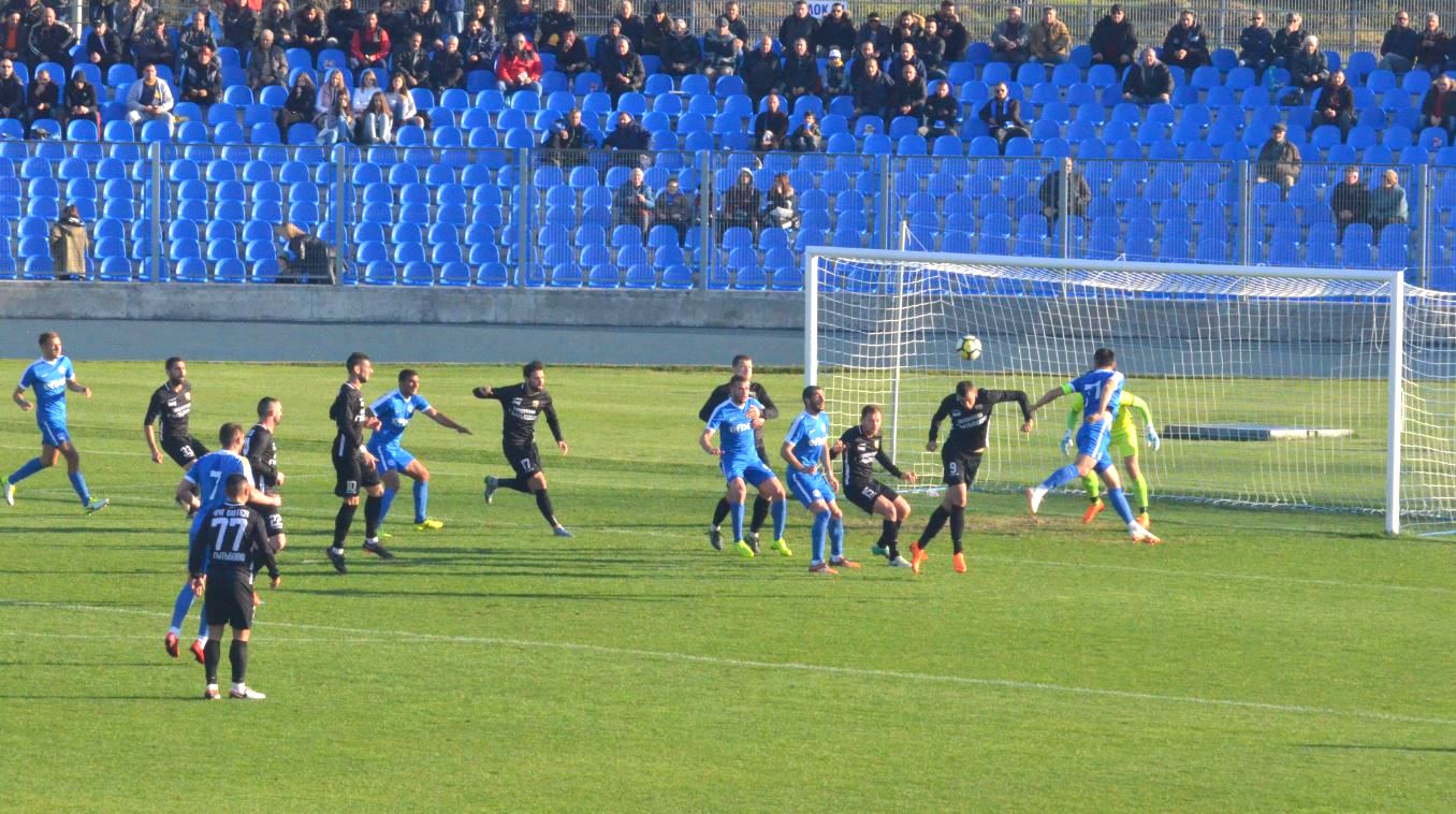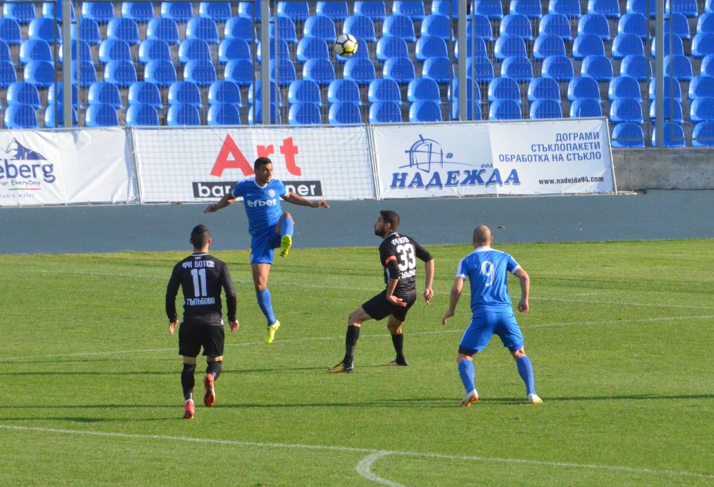 Малко преди края на първото полувреме отново Караджов бе на своето място, спасявайки удар на футболист от Ботев Гълъбово. В 45-та минута главният съдия Железов отсъди дузпа за гостите за игра сръка на Румен Сандев. Зад топката застана Методи Костов, който бе точен и възстанови равенството, при което завърши първото полувреме. Решението на рефера бе оспорвано от домакините, които смятат, че е нямало никаква дузпа.