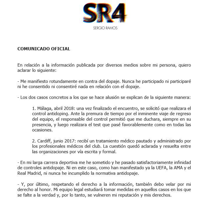 “Със сигурност ще взема мерки, защото се опитаха да опетнят името ми. В последните 15 години никога не съм отказвал допинг пробва. Ако е имало нещо позитивно по време на кариерата ми, това е работата ми на терена”, заяви още Серхио, който пусна и официално съобщение в своя защита.