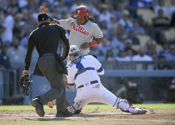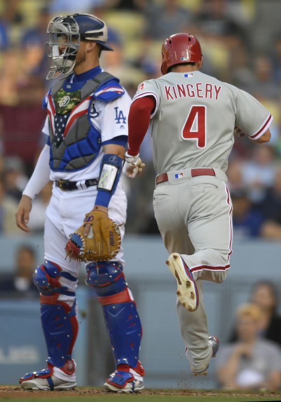 Лос Анджелис изравни с RBI-сингъл на Енрике Ернандес в затварянето на 5-ия, но в 7-ия Филаделфия отново излезе напред благодарение на двоен хит на Алфаро, който се оказа и победен. Стартерът на "филитата" Аарън Нола (W 7-2) изработи 7 ининга със 7 страйкаута и 2 хита, а Серантони Домингес (S 2) довърши мача с 2 перфектни ининга. Загубата на домакините пое Джош Фийлдс (L 2-2), хвърлял само в 7-ия.