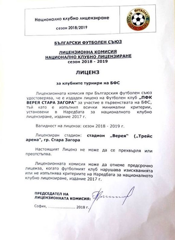 По-рано днес обаче от "Трейс Арена" се похвалиха със снимка на официалния си сайт, че имат така важния документ, издаден от Лицензионната комисия към БФС и даващ им право и догодина да се борят с най-добрите у нас. "По този начин Верея категорично опроверга всички спекулации в медийното пространство, че няма да започне новия сезон", се казва в официалното изявление на клуба от Града на липите.