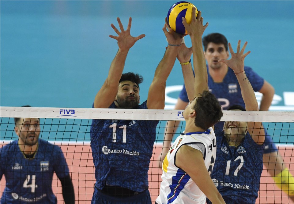 Домакините от Аржентина тръгнаха по-добре в първата част и благодарение на звездата си Факундо Конте и Томас Лопес я взеха с убедителното 25:19. Втория гейм се превърна в истински трилър. Италия водеше със 17:11 и по всичко изглеждаше, че ще изравни геймовете, но влезлият като резерва за "гаучосите" Лисандро Дзаноти обърна развоя му. Стигна се до драматично равенство при 29:29, като нито един от двата отбора не беше готов да се откаже. Последваха нови вълнуващи моменти и разигравания, но в крайна сметка Аржентина го измъкна с 33:31 след нова атака на Конте. Аржентинците продължиха да играят "под пълна пара" в началото на третия гейм и поведоха с 14:9. "Адзурите", обаче, не се предадоха и стопиха пасива си до 20:21, но силите им стигнаха само до тук. Аржентина спечели гейма с 25:20 след блокада на Мартин Рамос, а с това и победата с 3:0.