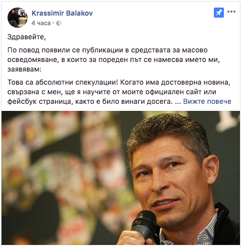 Красимир Балъков отговори на спекулациите в последните дни, които го свързват с ЦСКА-София. Мениджърът на Етър публикува официално съобщение в официалната си Facebook страница.