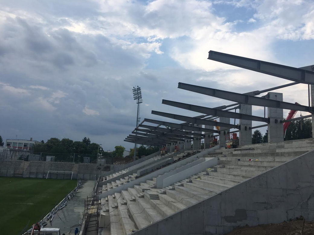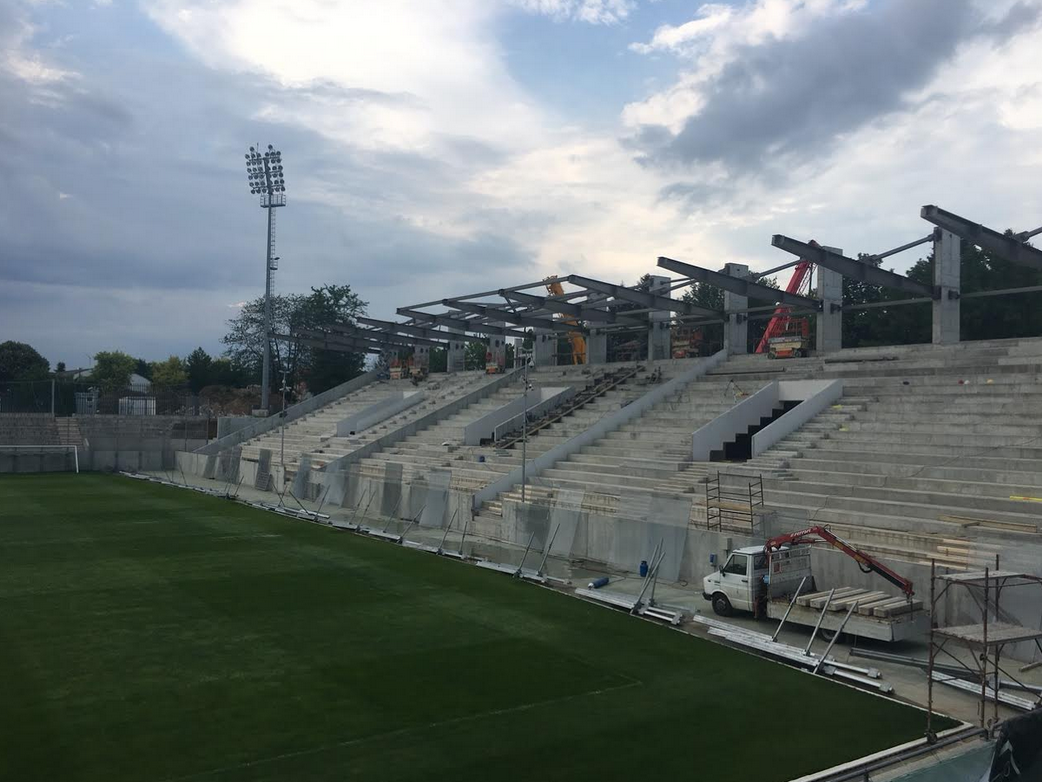 Грубият строеж е завършен. Изградени са входовете на трибуната и е стартирала работа по поставяне на козирката. За целта вече са положени основите. В следващите дни предстои работа по поставяне на седалките.