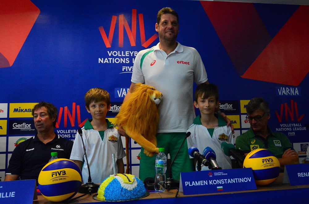 Селекционерът на мъжкия национален отбор на България Пламен Константинов бе изненадан приятно с торта във формата на волейболна топка и лъвче по случай 45-ия си рожден ден.