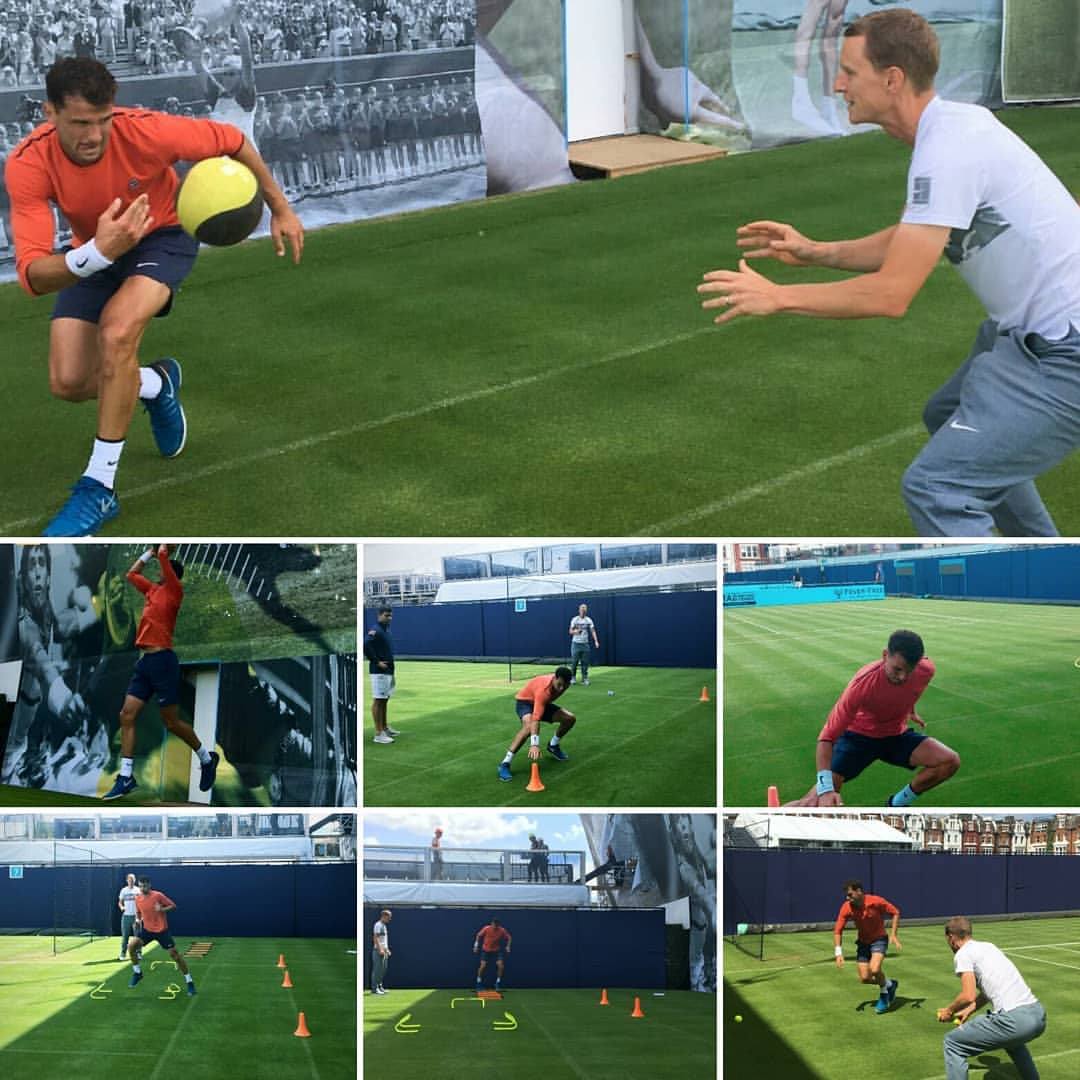 Най-добрият български тенисист Григор Димитров не спира да тренира усилено в Лондон преди началото на турнира в “Куинс” от категория АТР500, където именно следващата седмица ще стартира сезона си на трева. Българинът набляга на физически занимания под зоркия поглед на кондиционния си треньор Себастиен Дюран.