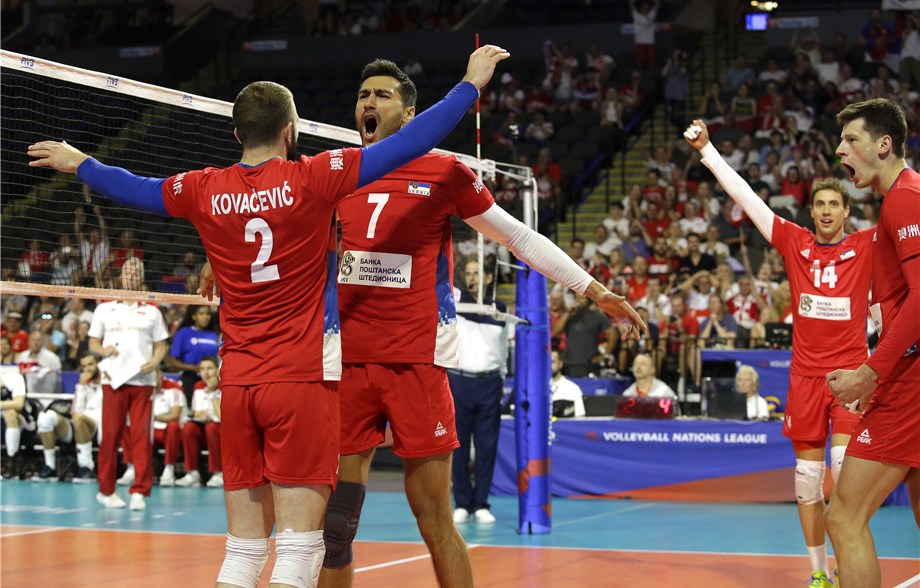 Националите на Сърбия записаха 8-и успех в Лигата на нациите, след като надиграха категорично световните шампиони от Полша с 3:0 (25:23, 25:23, 25:23) в мач от група 15, изигран в Хофман Естейтс (Чикаго). Така "плавите" заеха 6-ата позиция в класирането с 20 точки (8 победи, 4 загуби). Световните шампиони пък не успяха да постигнат нито една победа този уикенд и влязоха в серия от 3 поражения.