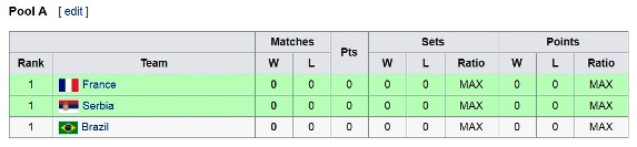 В Група А са домакините от Франция, които спечелиха и първото място в общото крайно класиране на груповата фаза. При тях попаднаха силният тим на Сърбия и олимпийските шампиони от Бразилия, които завършиха 4-и и 5-и.