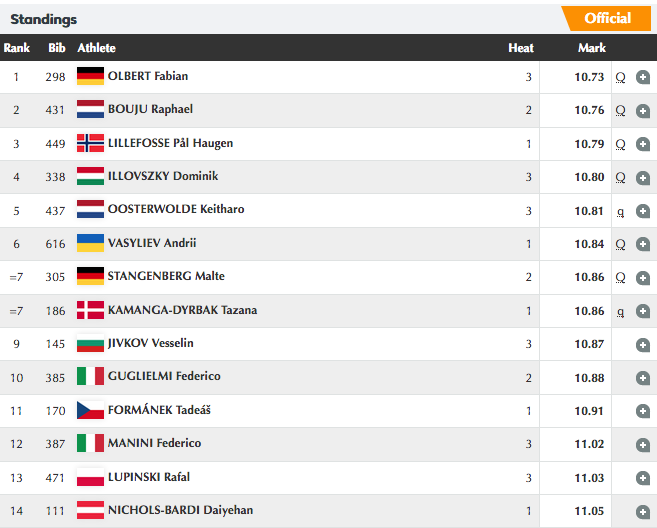 Тази първа серия обаче се проведе два пъти. Първият път имаше фалстарт, но само трима от осмината състезатели спряха, а останалите довършиха бягането. След това обаче швейцарецът Симон Граф беше дисквилифициран заради фалстарт и тази серия се проведе отново след другите две.