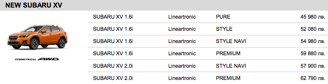 Всички версии на новия XV в България стандартно се продават със задвижване на четирите колела Symmetrical AWD и автоматична трансмисия. Така погледнато, цените, стартиращи от малко над 45 хиляди лева за най-базовата PURE версия и достигащи до над 62 хиляди лева за PREMIUM топ версията, са едни от най-конкурентните в класа и трябва да бъдат един от основните козове на модела.