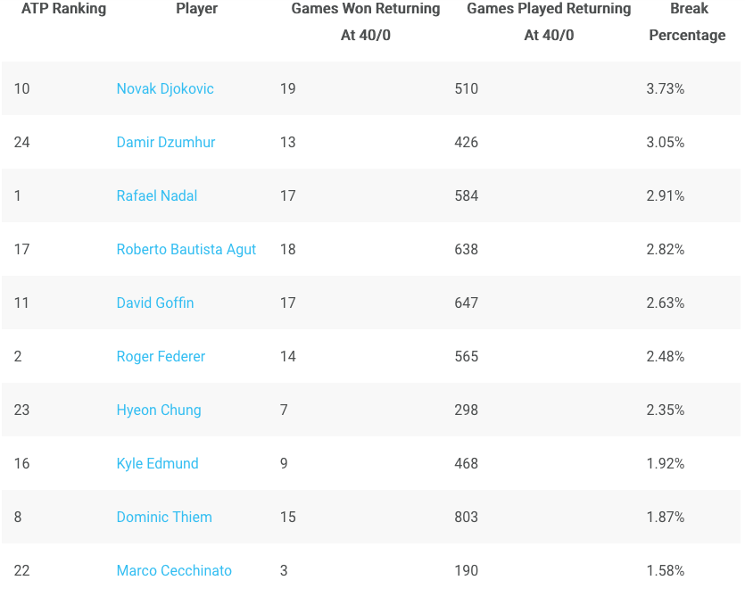 Сайтът на АТР публикува интересна статистическа класация (макар и не толкова важна и по-скоро периферна) на случаите, в които играчите от топ 25 на световната ранглиста по тенис успяват да осъществят пробив в моментите, когато изостават с 40-0. Оказва се, че тези подбрани състезатели средно успяват да направят брейк при 40-0 само в два от сто случая.