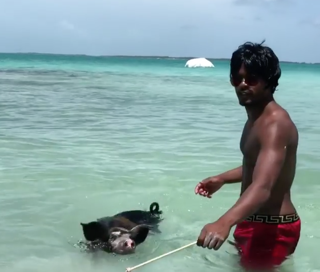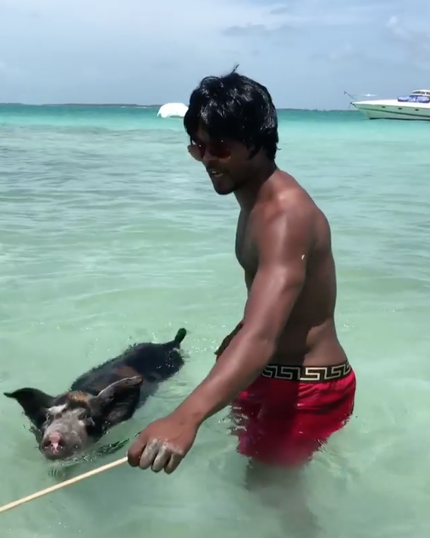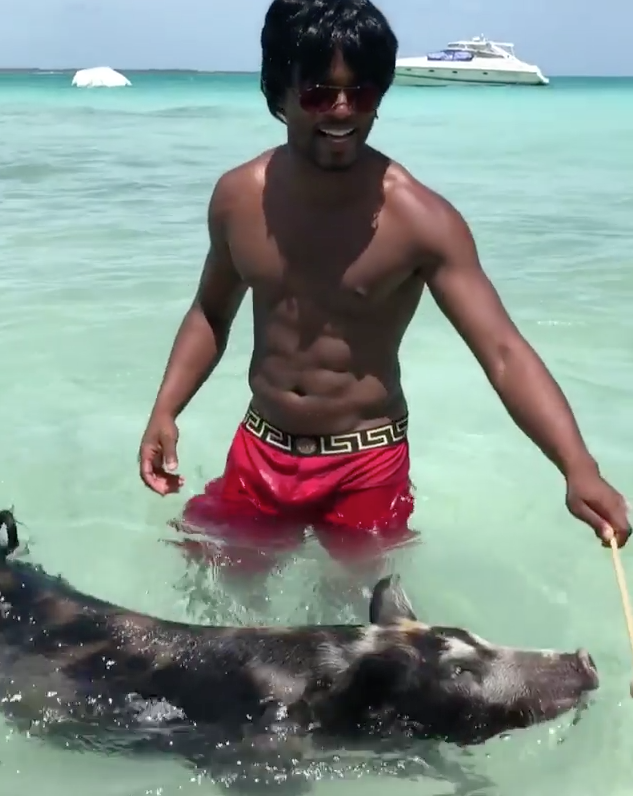 37-годишният бек пусна видео от екзотичен остров, на което носи перука и практикува прасеборство (подобно на бикоборството, но с прасе).