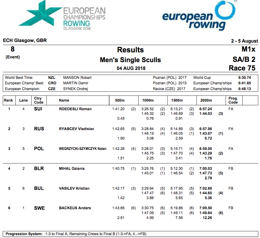 На първите 3 места, които дават право на участие на финала се класираха Роман Рьоелсли (Швейцария) - 6:57.24 мин, Владислав Рябчев (Русия) - 6:57.96 мин и Натан Вегрицки-Шимчик (Полша) - 6:59.00 мин.